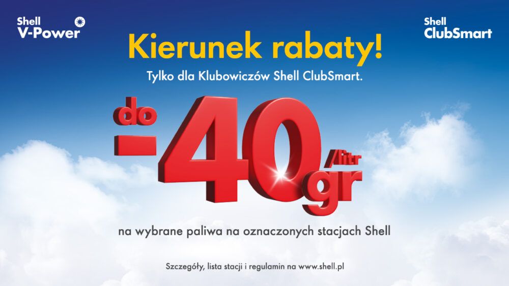 [2] Akcja promocyjna „Kierunek rabaty!” obowiązuje od 19 grudnia 2025 r. od godziny 13:00 do 28 lutego 2026 r. do godziny 23:59. W akcji promocyjnej mogą brać udział wyłącznie Klubowicze Shell ClubSmart, którzy zeskanują przed dokonaniem płatności kartę Shell ClubSmart wirtualną lub zarejestrowaną kartę plastikową i zatankują do jednego baku pojazdu z jednego dystrybutora minimum 20 litrów paliwa biorącego udział w akcji. Aby skorzystać z jednokrotnego rabatu -40 gr/l na wybrane paliwo, tj. Shell V-Power 95, Shell V-Power Diesel, Shell FuelSave 95 lub Shell FuelSave Diesel, należy przed dokonaniem transakcji aktywować, w aplikacji lub po zalogowaniu na konto na www.shell.pl, ofertę znajdującą się w sekcji Oferty/ Specjalnie dla Ciebie. Rabat 30 gr/l obowiązuje na paliwa Shell V-Power 95 i Shell V-Power Diesel, a rabat 20 gr/l na paliwo Shell FuelSave 95 lub Shell FuelSave. Rabaty 30 gr/l i 20 gr/l nie wymagają aktywacji i można wykorzystać każdy po 2 razy w grudniu 2025 r., styczniu 2026 r. oraz lutym 2026 r. Z promocji wyłączone jest paliwo Shell V-Power Racing i Shell AutoGas. Rabaty nie łączą się ze sobą i innymi promocjami na paliwo na stacjach Shell. Rabaty naliczane są od ceny regularnej danego paliwa, obowiązującej na wybranej stacji Shell i udzielane są przy kasie.