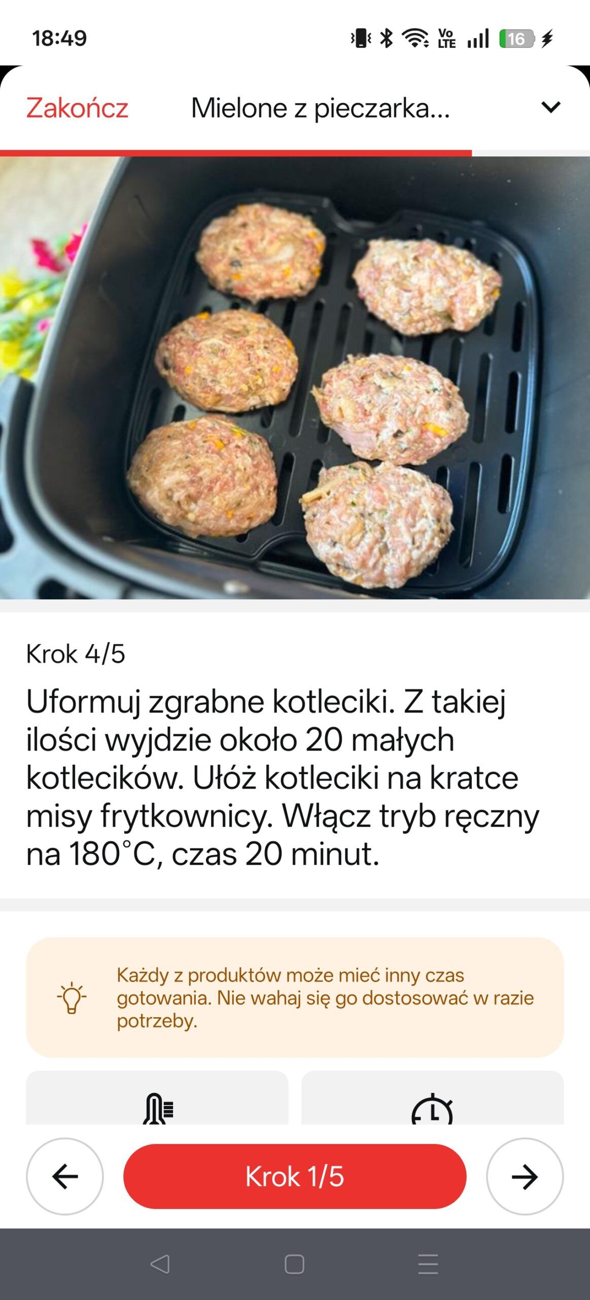 Wybór padł na mielone z pieczarkami i serem. Klasyk, który w teorii nie powinien sprawić żadnych problemów, ale właśnie o to chodziło — sprawdzić, jak wygląda cały proces od A do Z. Aplikacja My Tefal realnie prowadzi przez cały proces krok po kroku. Nie jest to tylko suchy przepis — dostajesz jasne instrukcje, co przygotować, w jakiej kolejności i mniej więcej ile to zajmie. Po chwili wszystko było już gotowe do działania. Mięso z dodatkami trafia na tackę, ta do kosza i… praktycznie tyle. Następnie ustawienie temperatury, czasu i start.