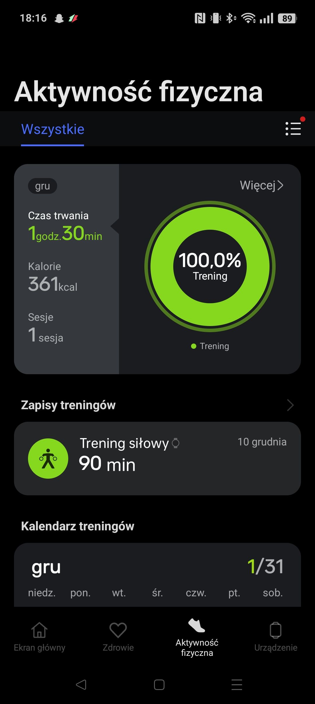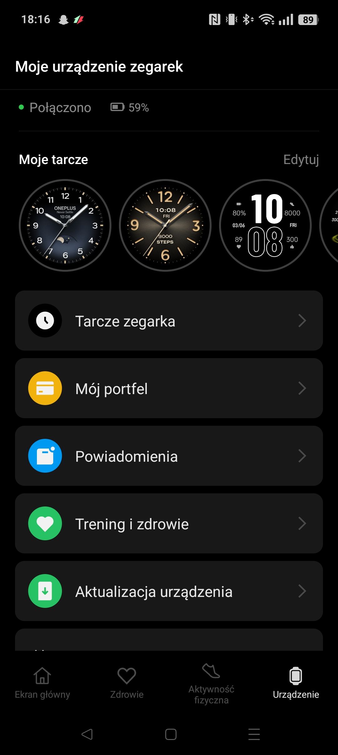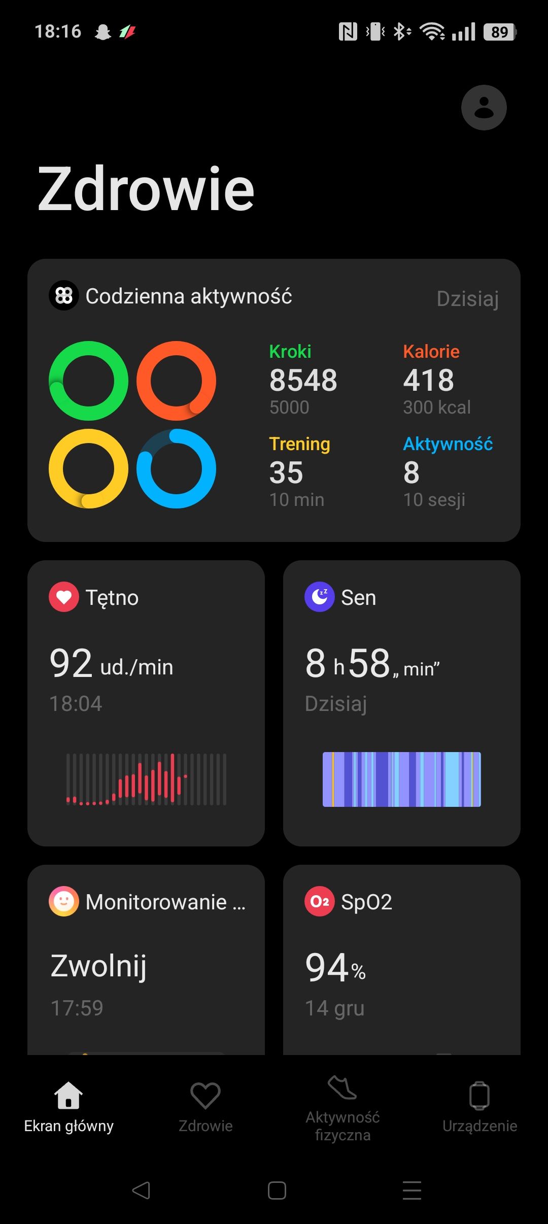 Skoro już wspomnieliśmy o aplikacji OHealth, warto na chwilę się przy niej zatrzymać, bo to właśnie ona w dużej mierze definiuje codzienne korzystanie z OnePlus Watch Lite. Jest to centralne miejsce, w którym zbiegają się wszystkie dane z zegarka — od aktywności fizycznej, przez pomiary zdrowotne, aż po ustawienia samego urządzenia. Interfejs aplikacji jest czytelny i uporządkowany, dzięki czemu nawet osoby mniej obeznane ze smartwatchami bez problemu odnajdą się w dostępnych opcjach.