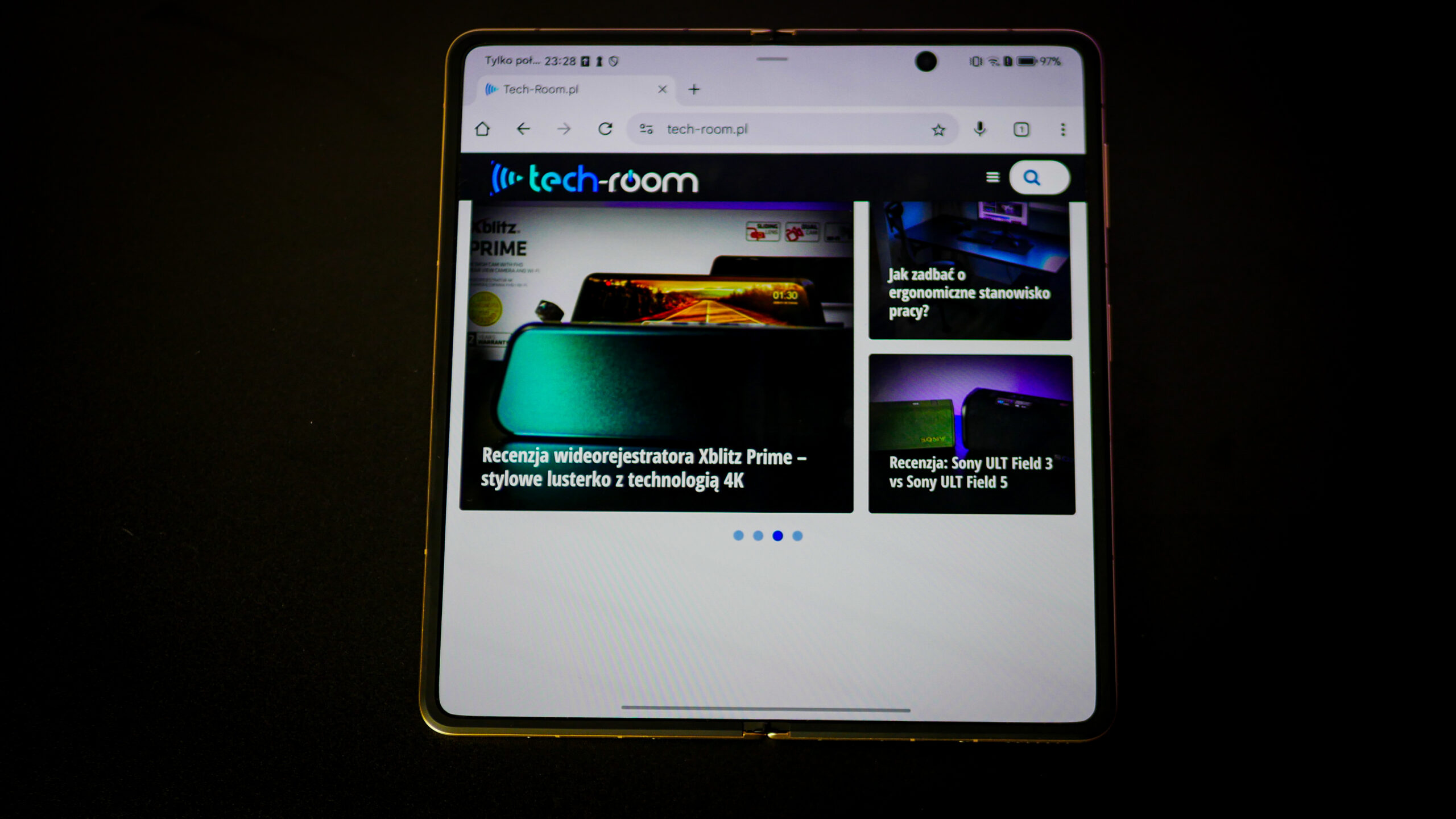 Jednak łączenie, tudzież zgięcie ekranu nadal bywa wyczuwalne pod palcem w miejscu łączenia, szczególnie przy oglądaniu jasnych, jednolitych powierzchni (np. jasne strony internetowe). To nie wada dramatyczna, ale przypomina, że technologia składania nie jest idealna – jeszcze.