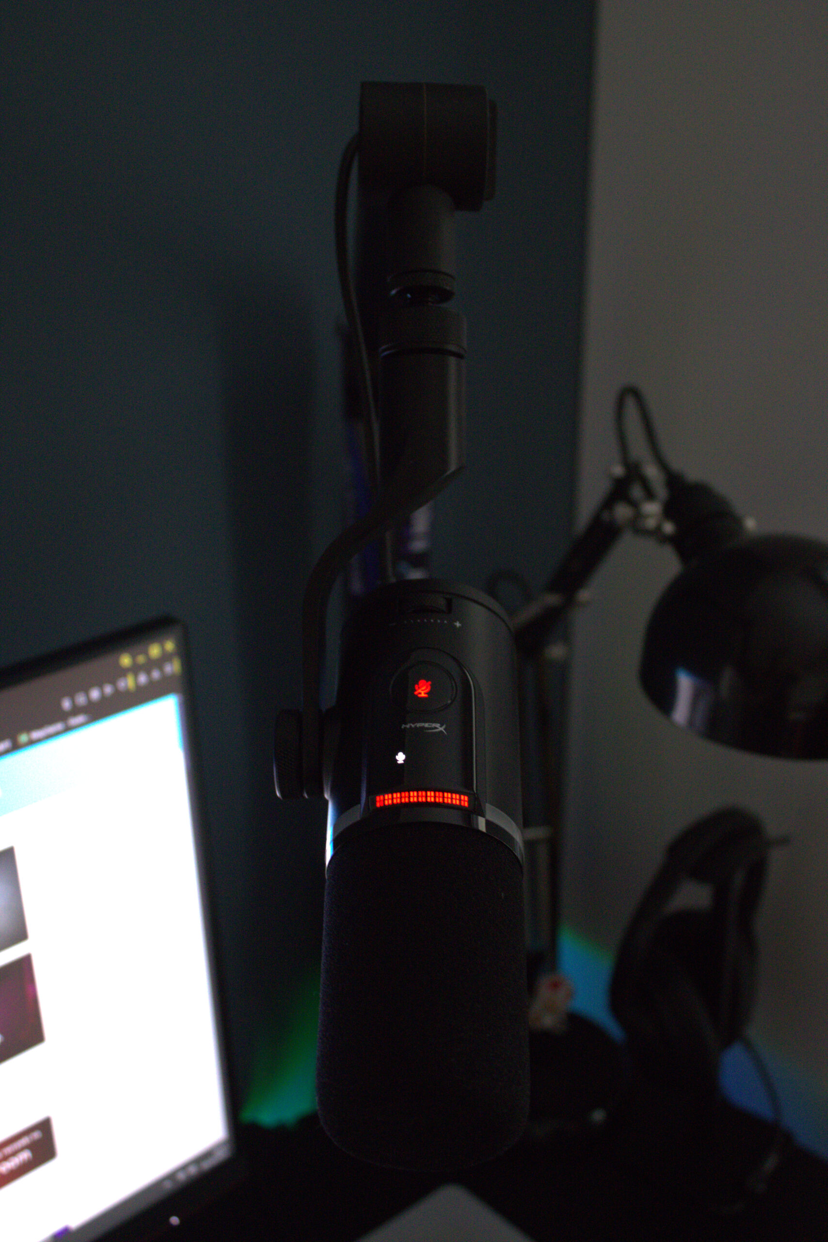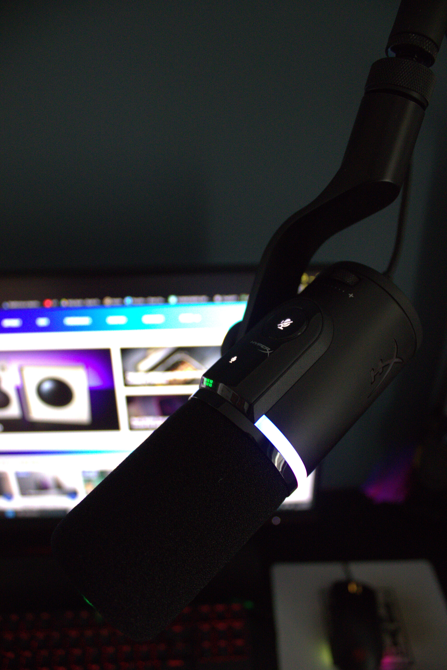 Ja na szczęście dysponuję ramieniem, które okazało się być kompatybilne z FlipCast, więc od razu zamontowałem na nim mikrofon i podłączyłem do komputera. O prawidłowym sparowaniu poinformował mnie stonowany pasek LED, który zaczał mienić się w różne kolory w zależności od statusu. Na mikrofonie pojawił się też panel sterujący – pozwala na wyciszenie sprzętu (plus za to, że jest dotykowe, a nie mechaniczne, więc samo wyciszenie nie generuje żadnego dźwięku) oraz informuje diodą, czy mikrofon aktualnie rejestruje dźwięk, czy nie.