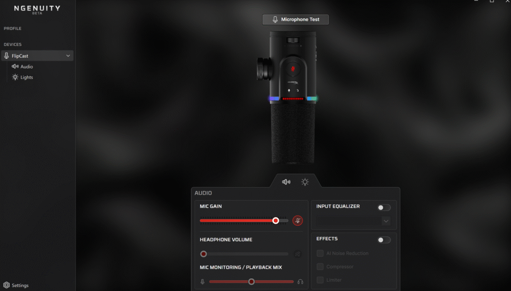 Dla tych, którzy lubią mieć pełną kontrolę nad swoim sprzętem, HyperX NGENUITY staje się nieocenionym narzędziem. Tak jak w przypadku większości sprzętów tej marki, po pobraniu aplikacji możemy w kilka sekund wejść w świat personalizacji FlipCast – nie chodzi tu tylko o wygląd, ale przede wszystkim o funkcje mikrofonu. W NGENUITY możemy regulować wzmocnienie, aktywować wbudowane filtry, włączać lub wyłączać presence boost i high-pass, a także dostosowywać charakterystykę nagrywania do własnych potrzeb. Dzięki temu każdy głos brzmi dokładnie tak, jak chcemy, niezależnie od tego, czy nagrywamy podcast, streamujemy, czy uczestniczymy w spotkaniach online. Choć FlipCast nie stawia na przesadzone RGB, NGENUITY pozwala też na drobne podświetlenie LED – subtelne, funkcjonalne i idealnie dopasowane do stanowiska, bez efektu “lampy dyskotekowej”. To narzędzie daje pełną kontrolę zarówno nad jakością dźwięku, jak i komfortem codziennego użytkowania mikrofonu.